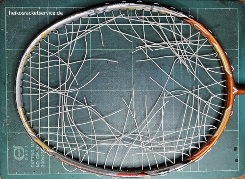 Die Saiten auf dem nachfolgenden Foto gelten übrigens eindeutig nicht als entfernt. Im Gegenteil - dieser Zustand ist sogar noch schlechter, als die Besaitung nach einem Riss so zu belassen wie sie war und wird entsprechend anders berechnet.